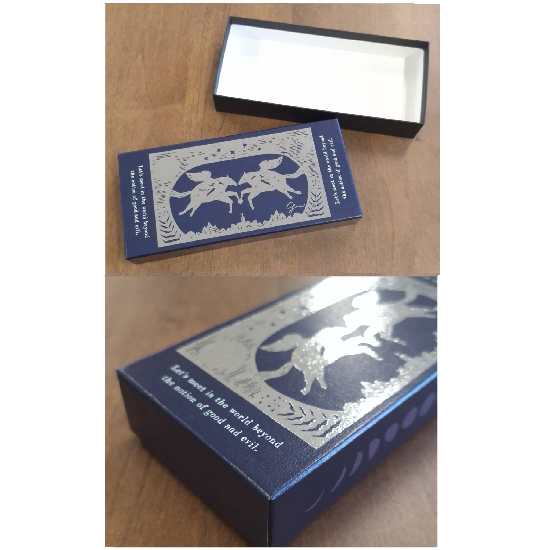 株式会社mokadocos様よりご依頼をいただき貼り箱の製作をお手伝いさせていただきました。蓋は全面にオンデマンド印刷をした後、真ん中のデザインを箔押で表現しています。月の満ち欠けや、夜空を思わせる紺色に、シルバーの箔がキラキラと映えるステキなデザインです。mokadocos様ご依頼ありがとうございました。
